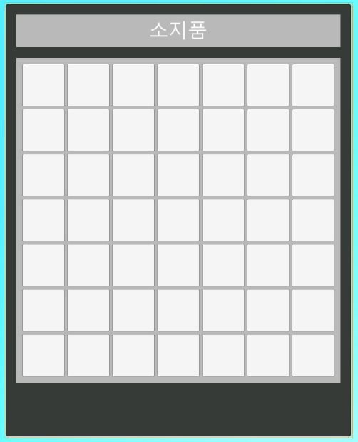 인벤토리의 크기는 7x7로 고정된 사이즈로 만들었다. 한 칸에 한 개의 아이템이 들어가고 소비 아이템 같은 경우는 개수를 사용해서 나타낸다.