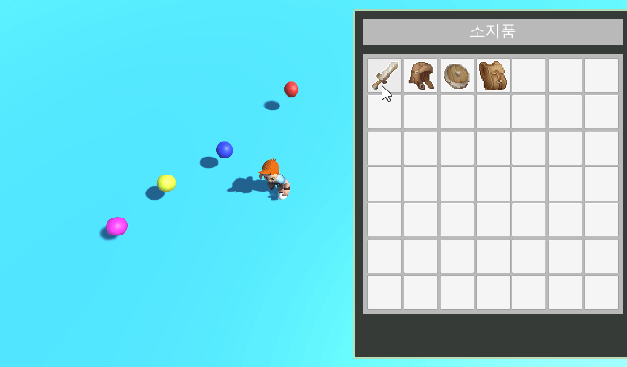 장비창은 인벤토리 창과 연계해서 제작했다. 인벤토리에서 장비 아이템에 마우스 우클릭을 하면 부위에 맞게 자동으로 장착된다. 반대로 장비창에서 마우스 우클릭을하면 인벤토리창으로 돌아간다.
