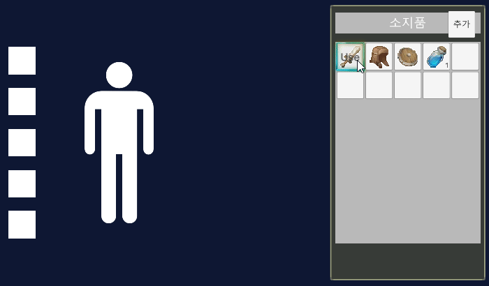 인벤토리에 스크롤 기능을 추가 하다보니 슬롯을 드래그해서 아이템을 교환하거나 장착하는 기능을 사용하기 애매해졌다. 사용 불가능 한건 아니지만 버튼을 드래그하는 이벤트와 스크롤을 드래그하는 이벤트를 분리해야 되는 문제가 생겼다. 그래서 슬롯 드래그 기능은 삭제하고 슬롯을 한번 클릭하면 해당 슬롯에 하이라이트 기능을 추가하고 한번 더 클릭 시 사용 or 장착되도록 기능을 변경했다.